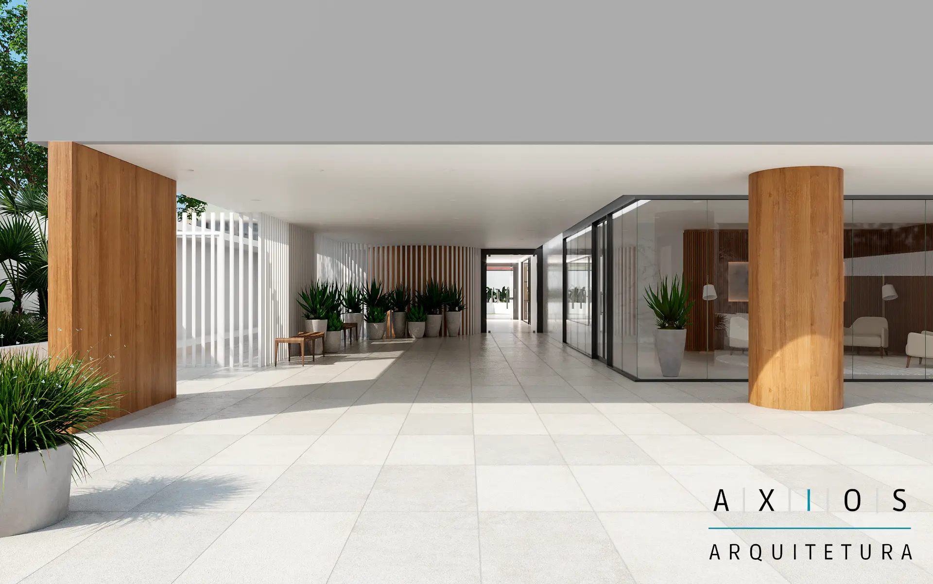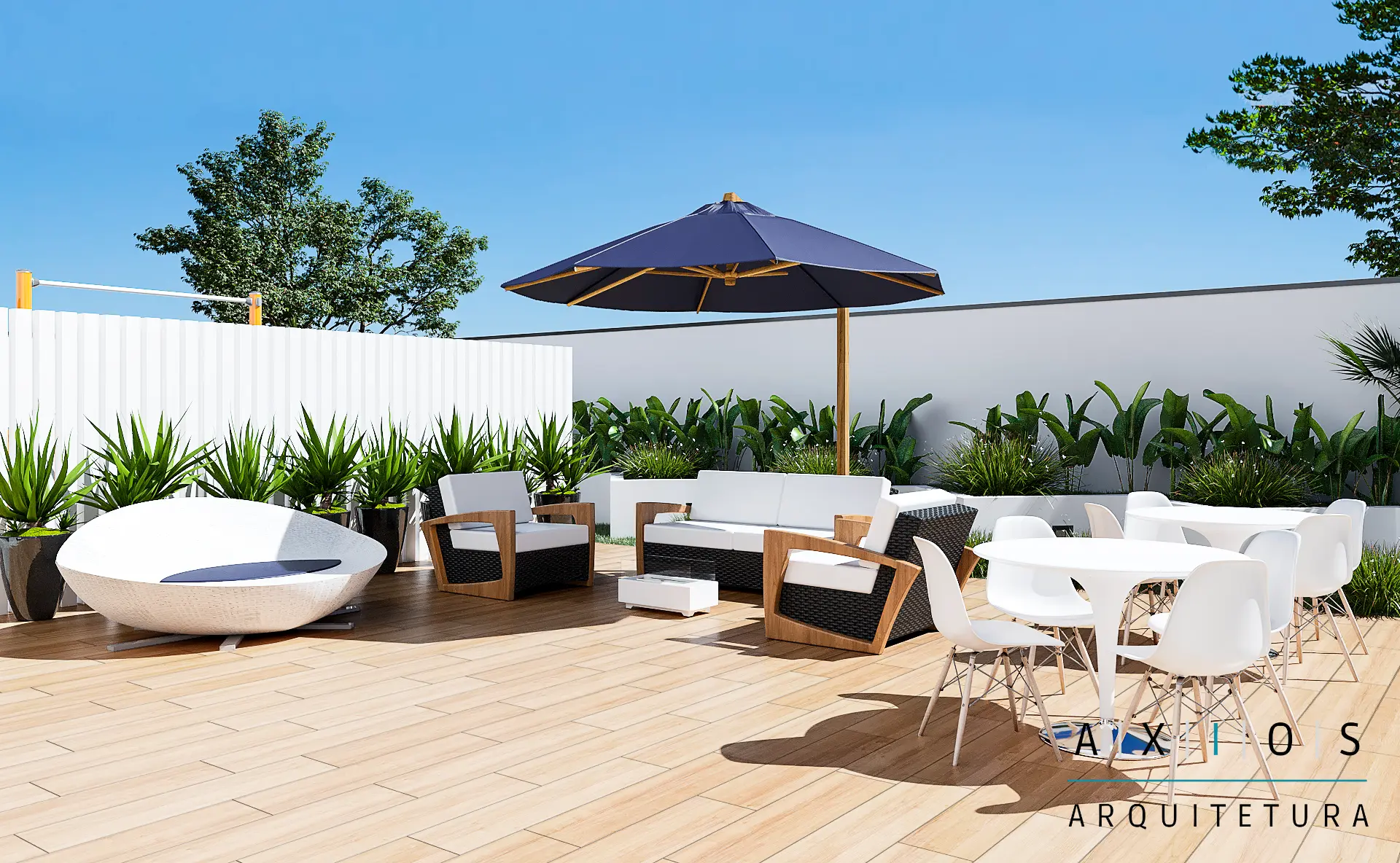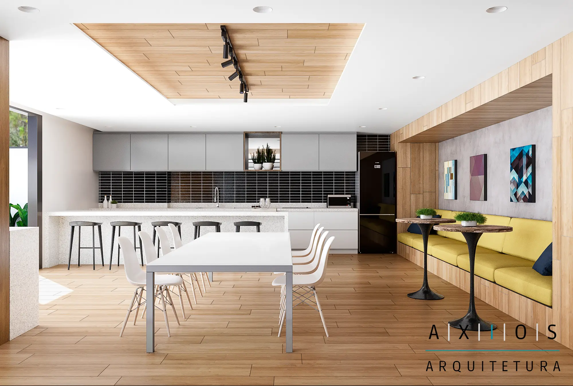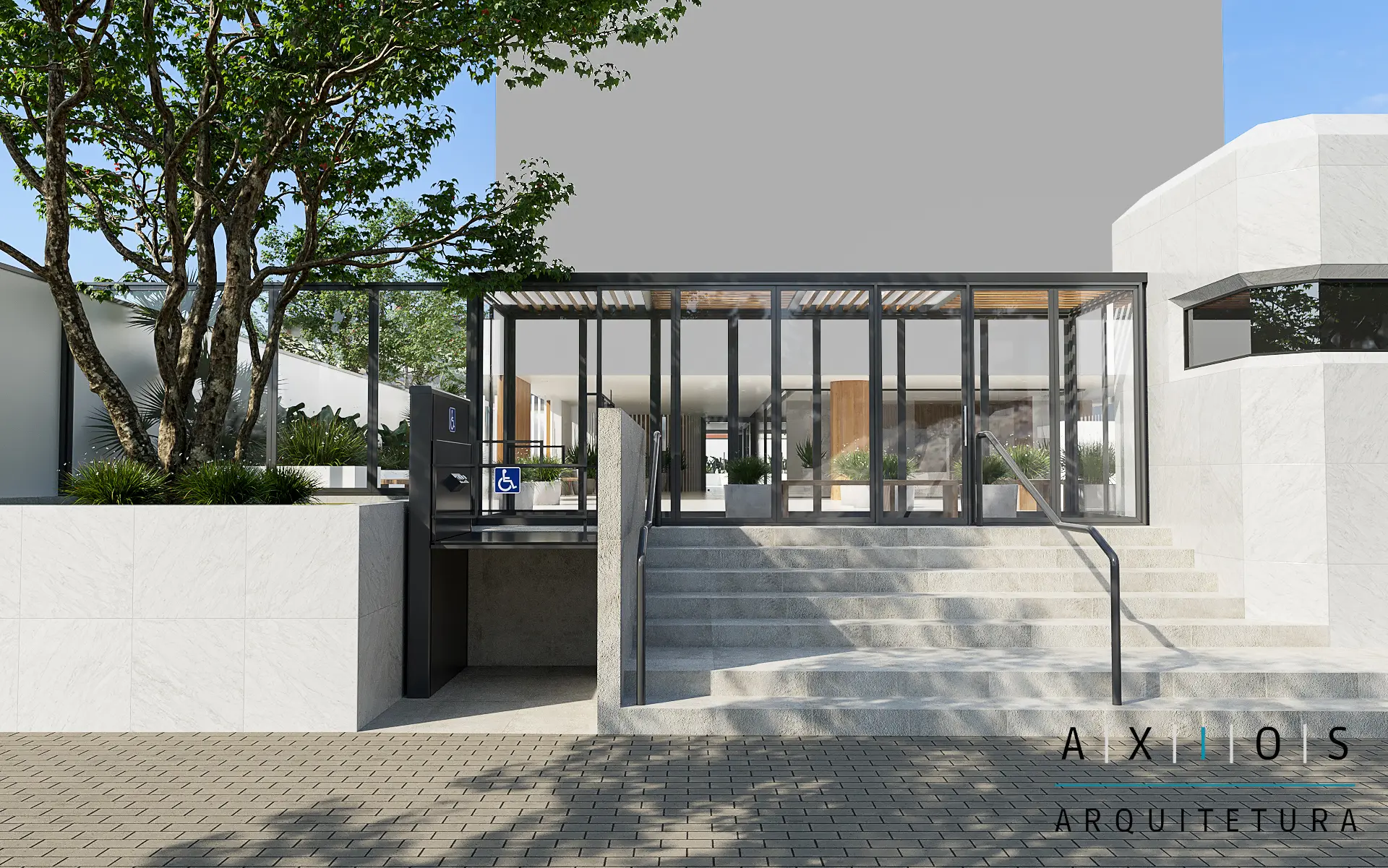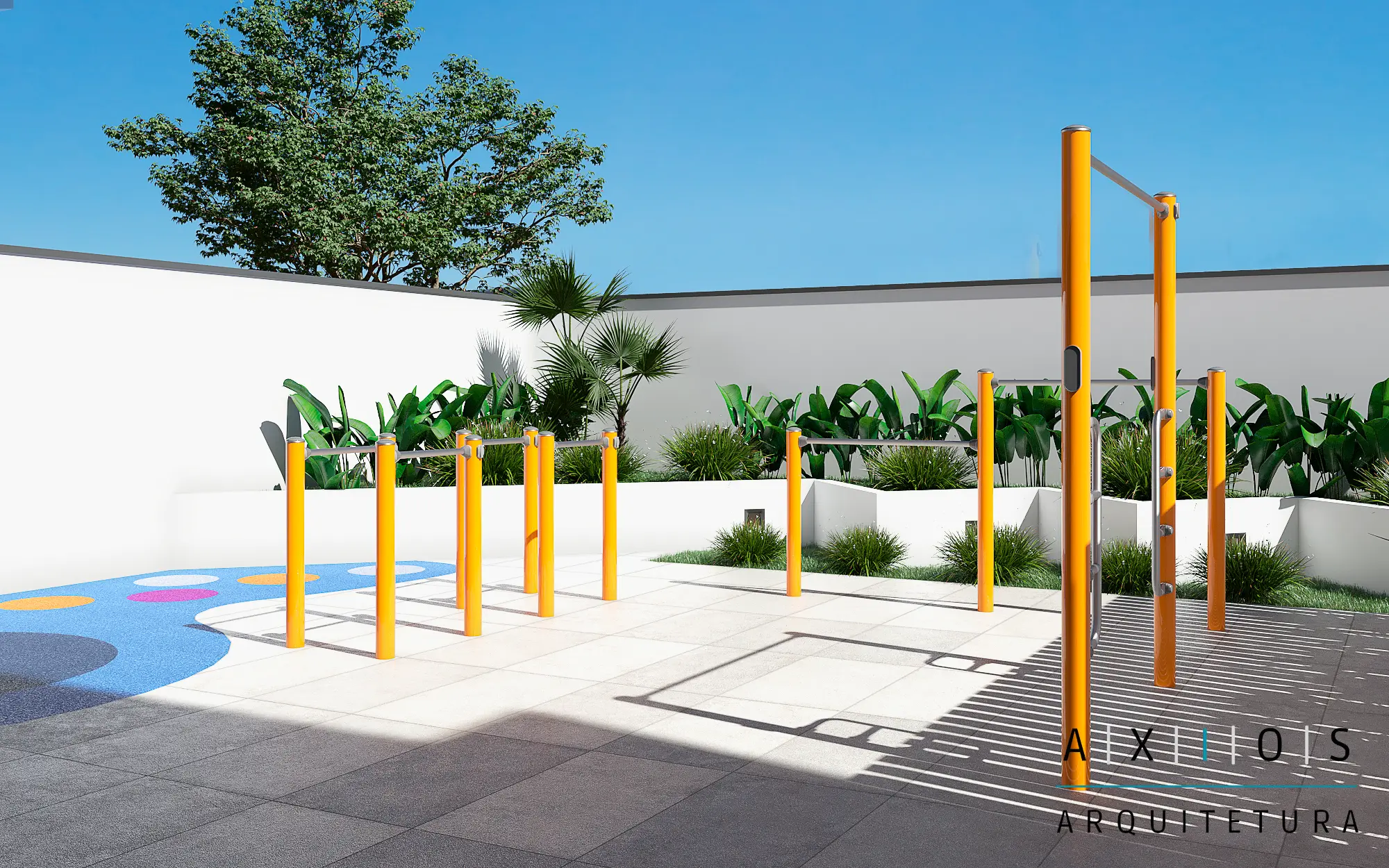 A Axios Arquitetura implementou rampas de acesso com inclinações normatizadas e sinalização tátil, além de revitalizar o salão de festas e a área de churrasqueira. Toda a infraestrutura hidráulica e elétrica dessas áreas foi renovada para suportar novos equipamentos de lazer e eventos.